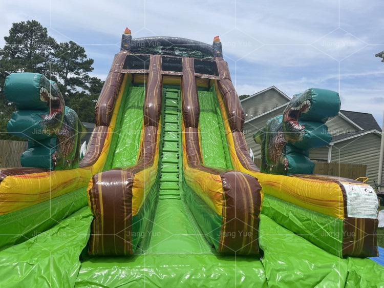 Climb to the top of this prehistoric hill where you will face a Tyrannosaurus who is out looking for her dinner!  The rocky terrain leading to your entry is something to behold!  Go deeper into the badlands and look for the perfect place of refuge.  There you will find your spot and become the greatest explorer of all time!!  This vibrant Dinosaur Slide brings to life all of the adventure and intrigue of a prehistoric journey.  You will be able to climb, slide, and tumble around this forgotten land, and won’t have to worry about the wrath of these creatures!  Your slide to the bottom brings you to a young, hatching TRex.  Is this what mama-Rex was looking for all along?  This slide can be used wet or dry.  The dimensions for this product are 20′ x 38′ x 16′.