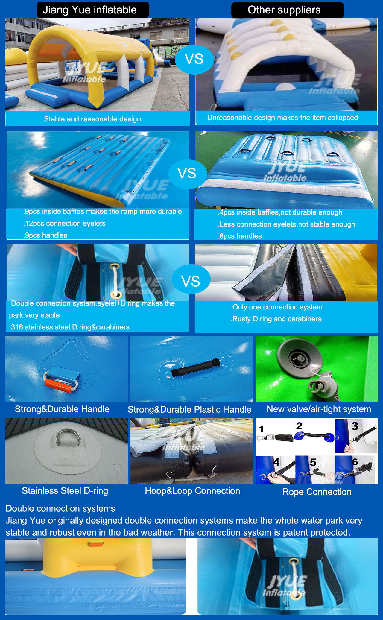 Jyue originally designed double connection systems that make the whole water park very stable and robust even in the bad weather. This connection system is patent protected.